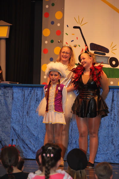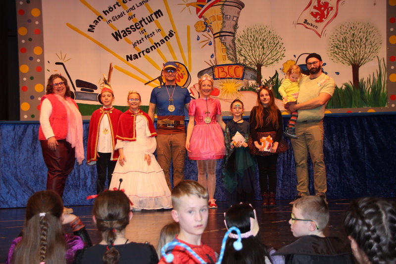 Familie Waldmann von der Villa Kunterbunt hatte Preise für die Kostümprämierung gespendet. Die vielen, tollen Kostüme und fantastisch geschminkten Gesichter machten es Sonja Lehmann (Ausschuss für Soziales, Kultur und Sport), Prinz Fabian I. und Prinzessin Carina I., schwer, zu entscheiden, wer Preisträger sein sollte! Die Entscheidung fiel auf den Pfau – Charlotte Gonska, das Reh- Kathalena Hornbacher, sowie Pipi Langstrumpf mit Papa Langstrumpf – Paula und Franz Jahn, die den Sonderpreis der Villa Kunterbunt erhielten.